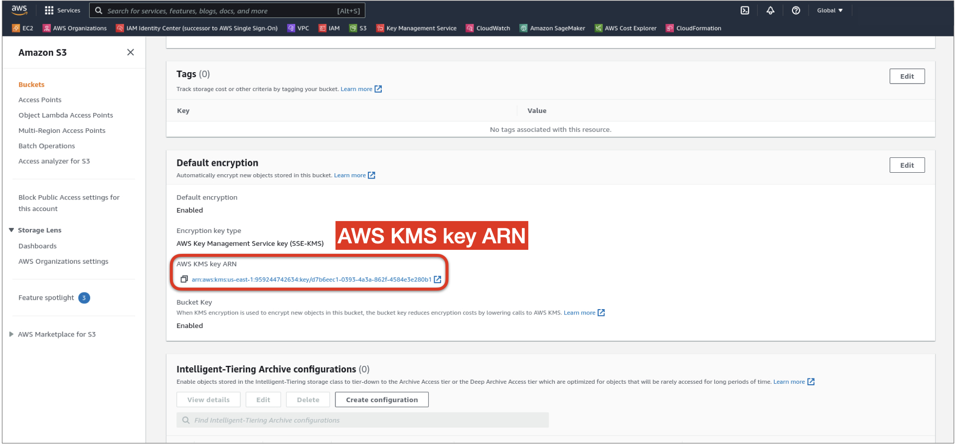 3. Scroll down to Default encryption and copy the AWS KMS key ARN