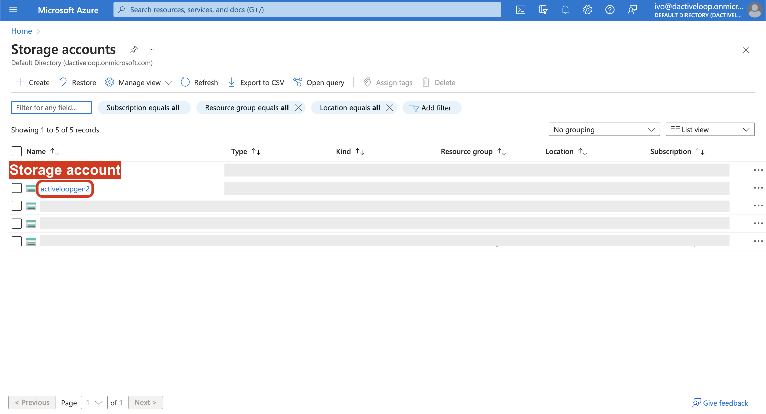 1. Go to the Storage accounts page in the Azure UI, which can be done by searching "Storage accounts" in the console.
