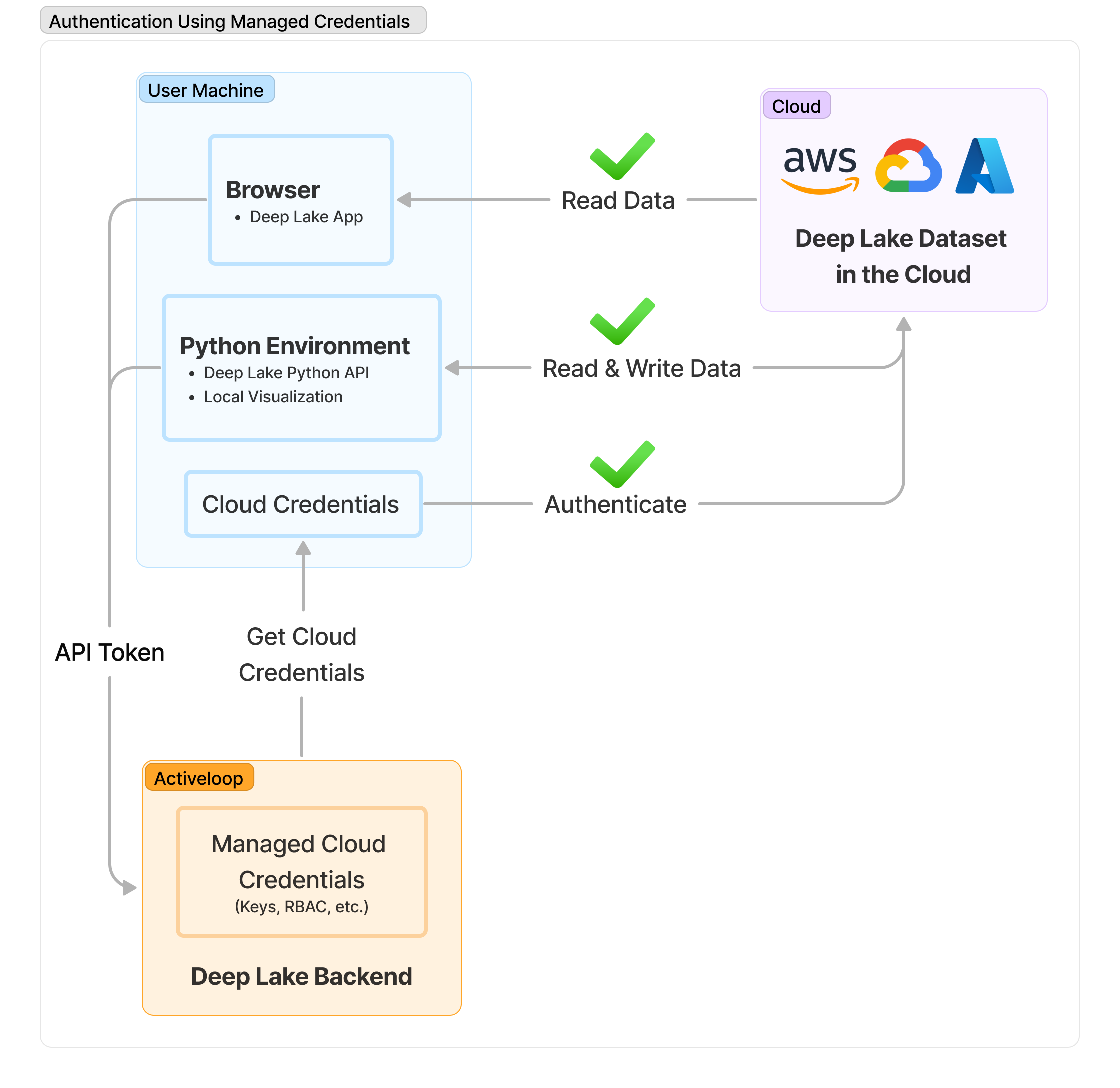 Deep Lake Managed credentials should be set up for granting the client access to cloud storage. Managed Credentials use IAM Policies or Federated Credentials on Activeloop's backend to generate temporary credentials that are used by the client do access the data.