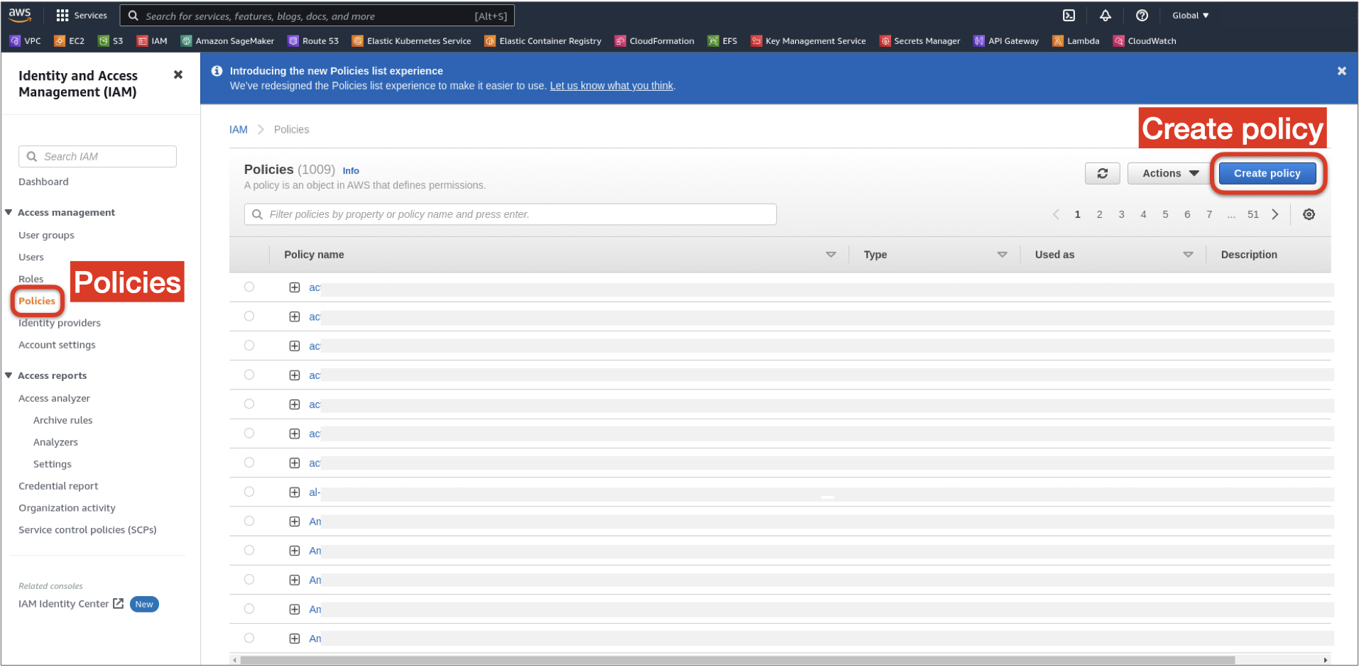 3. In the left nav, open the Policies under Access management and on Create policy on the right.