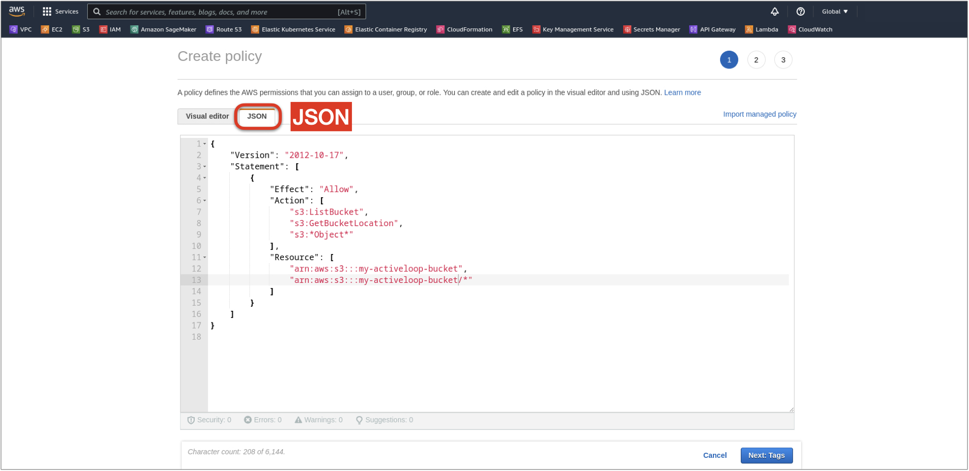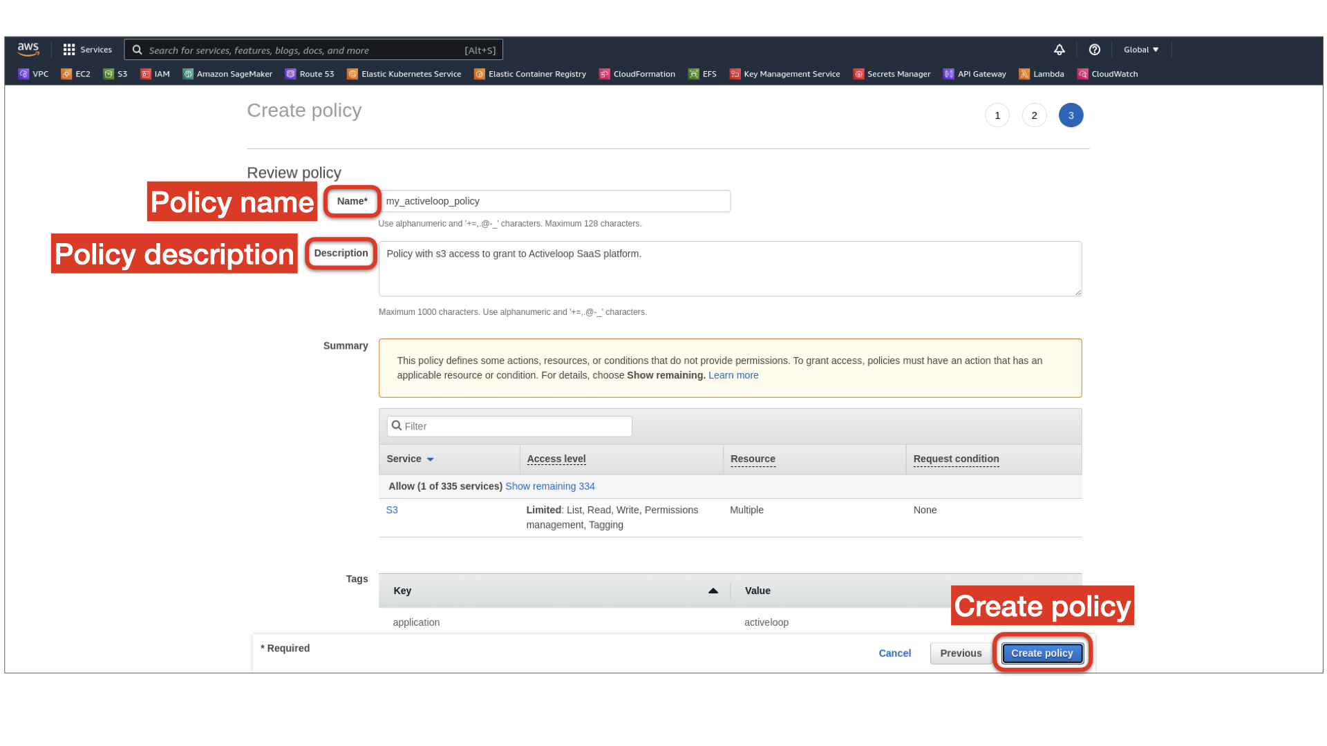 7. On the bottom right, click Next: Tags (create tags if needed) and Next: Preview, enter the policy name and description, and click Create policy