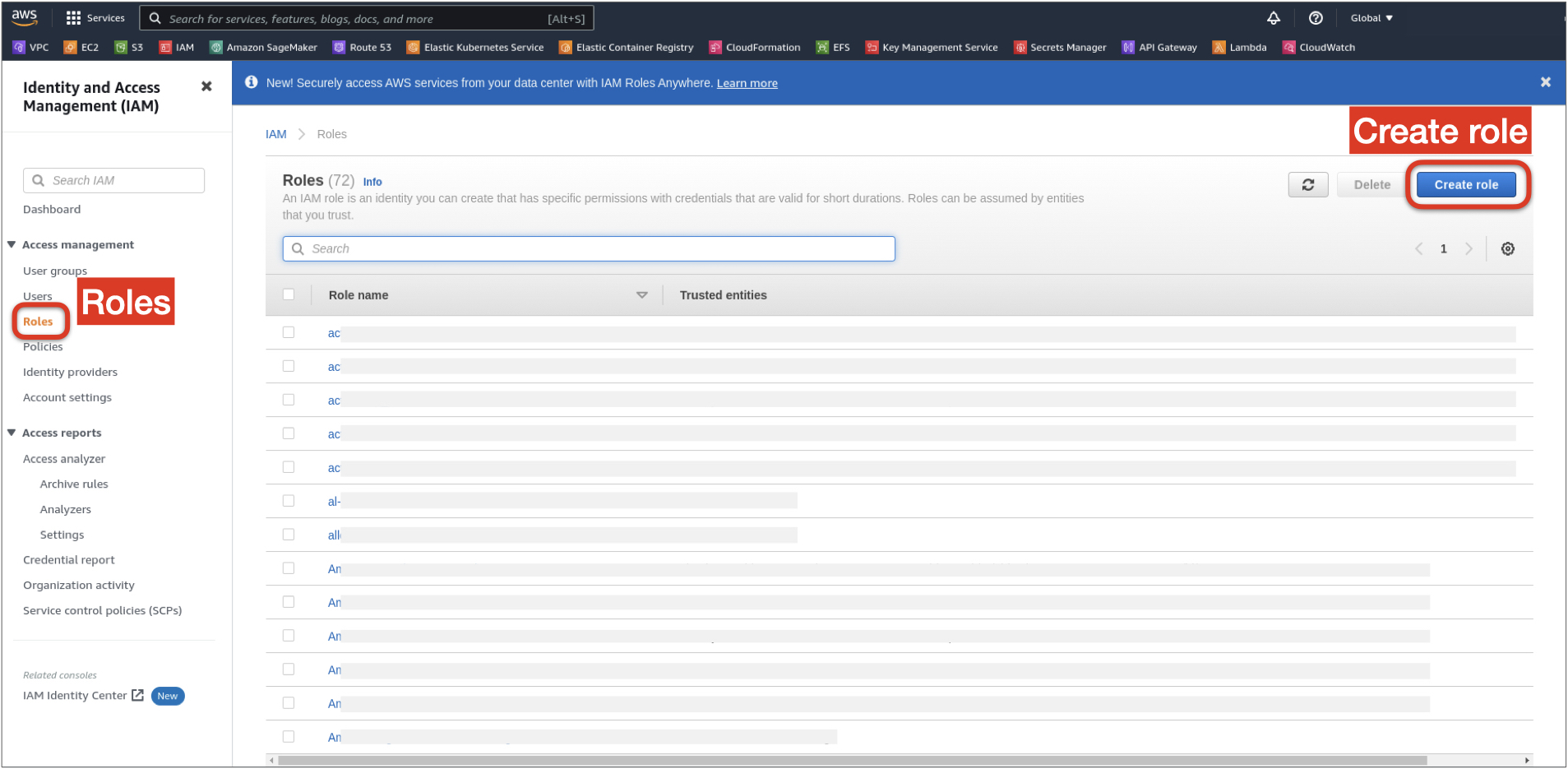1. On the IAM page, in the left nav, open the Roles under Access management, and click Create role on the right.