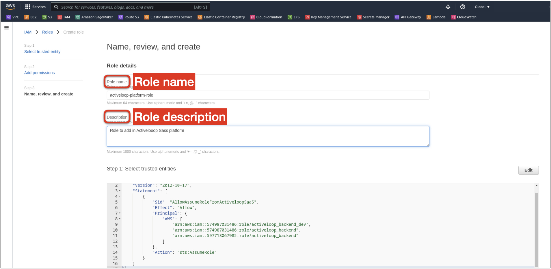 6. Set the name and description for the role and click Create role at the bottom.