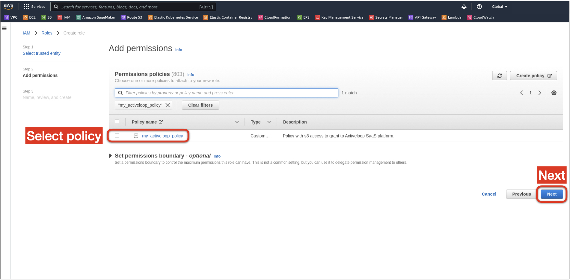 5. From the provided policy list, select the previously created policy from Step 1 and click Next