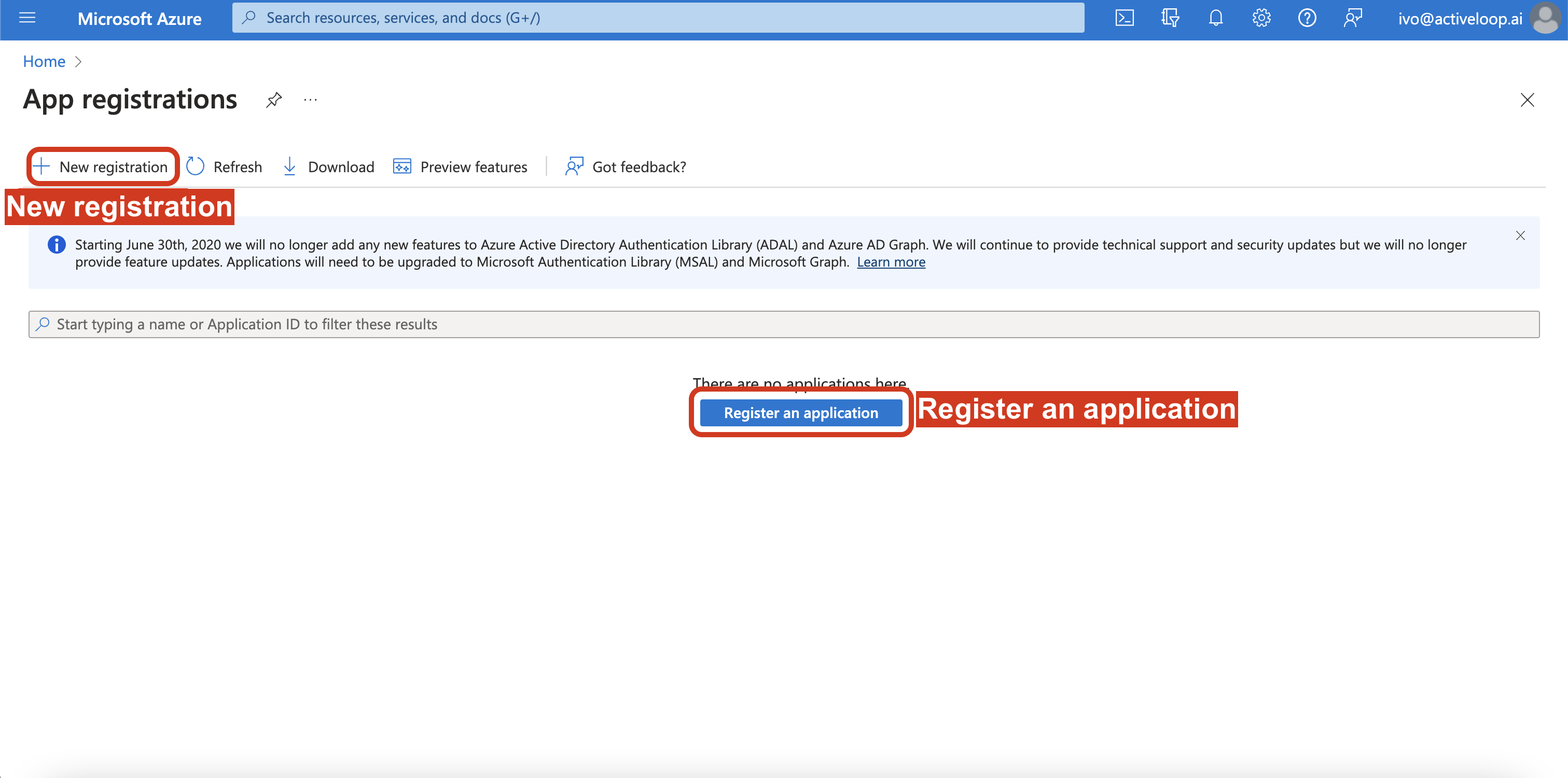 3. Click on Register an application or New registration.