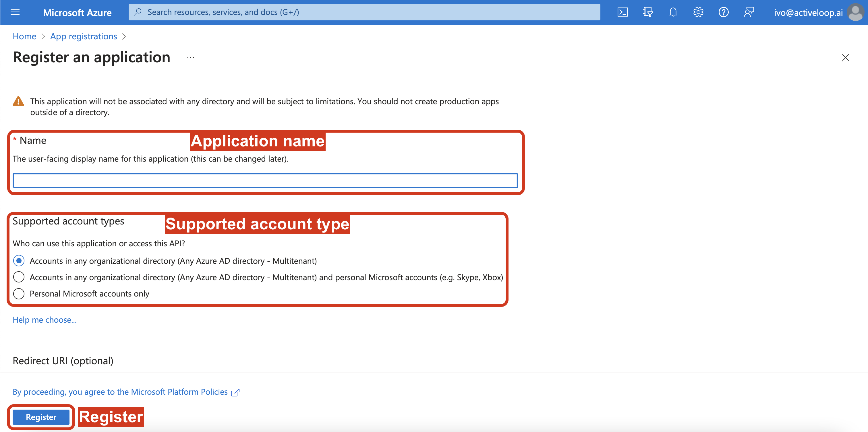 4. Enter the Name and Supported account type (all are supported in Deep Lake) and click Register