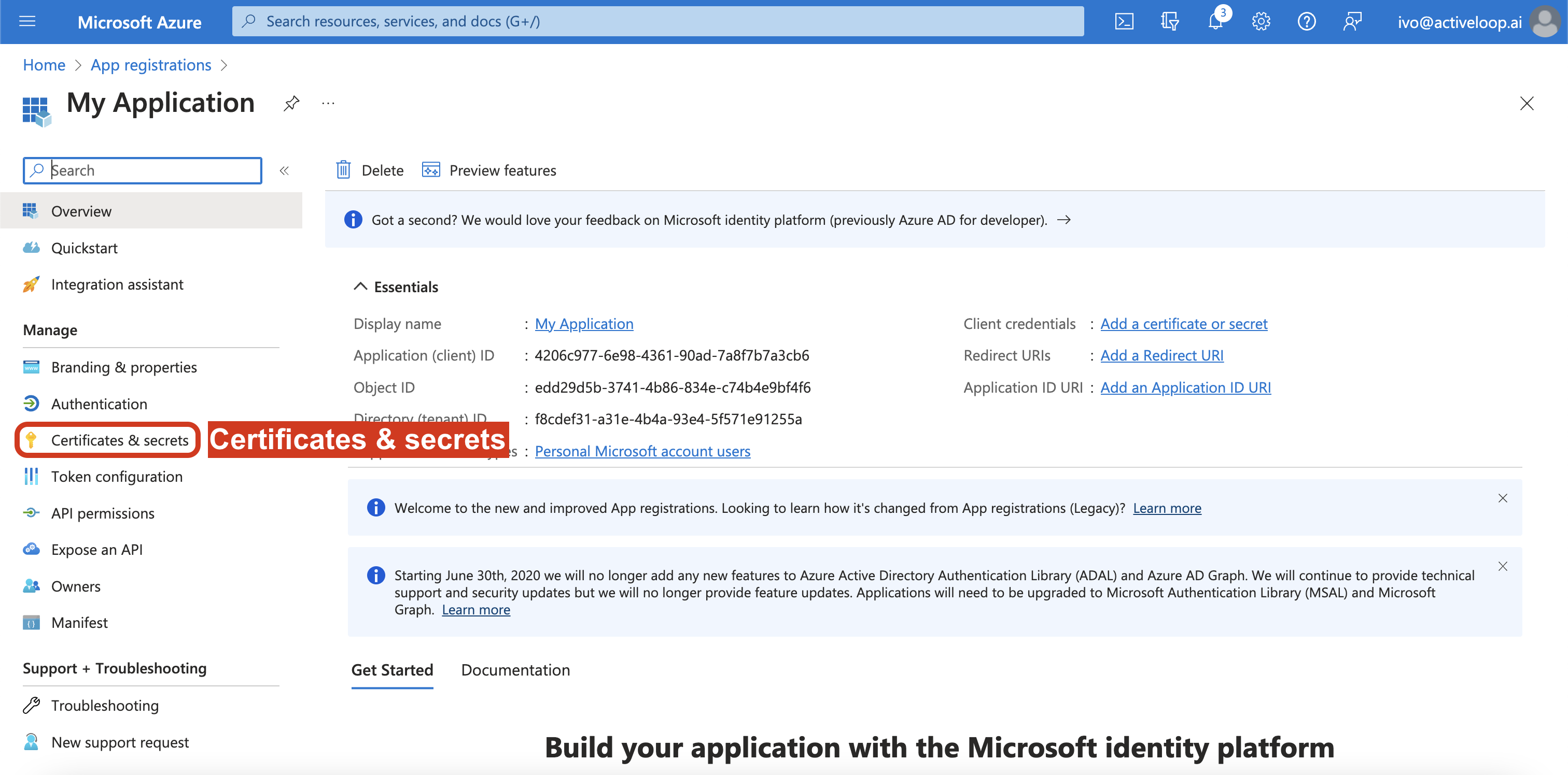 5. In the application console, click Certificates & secrets.