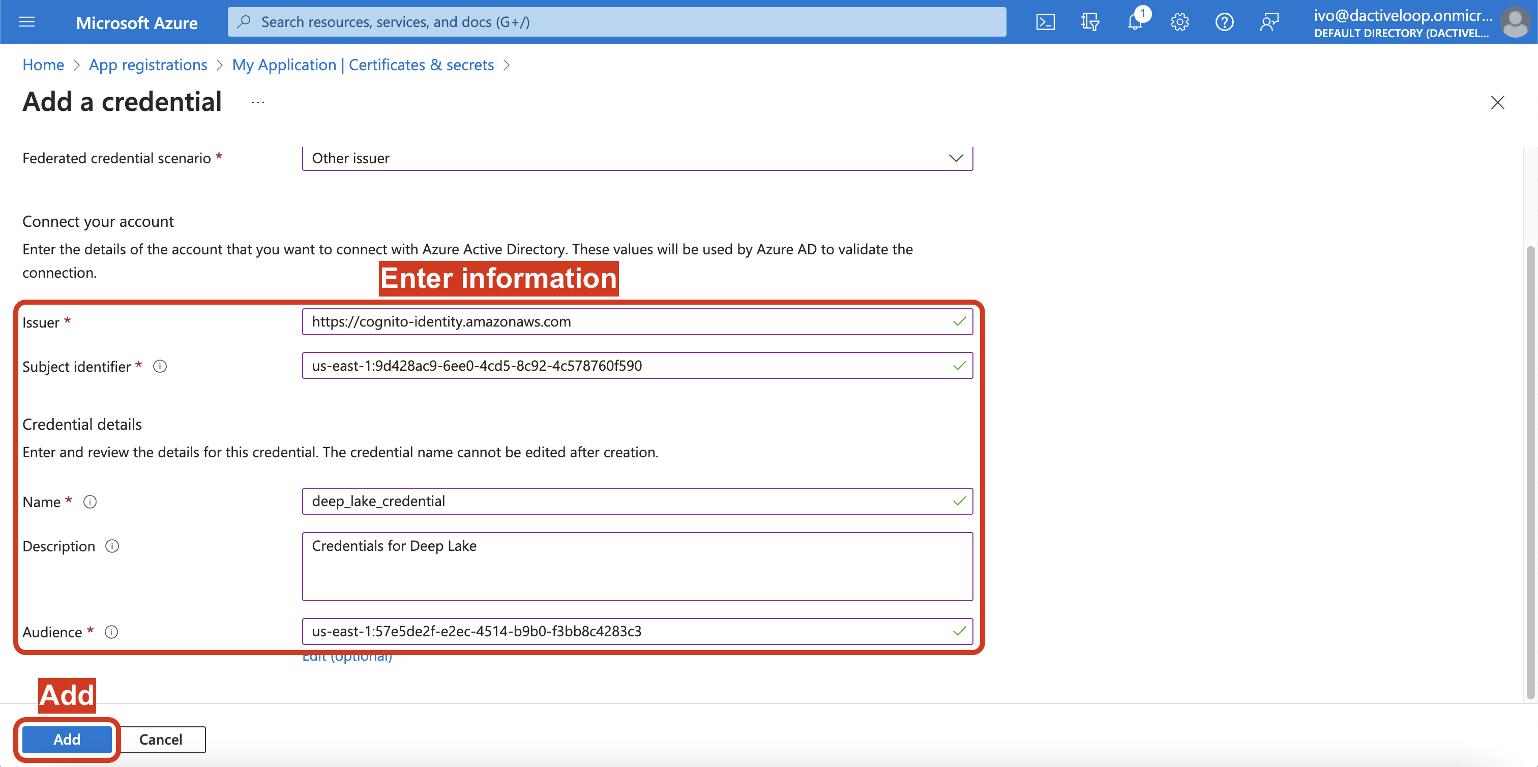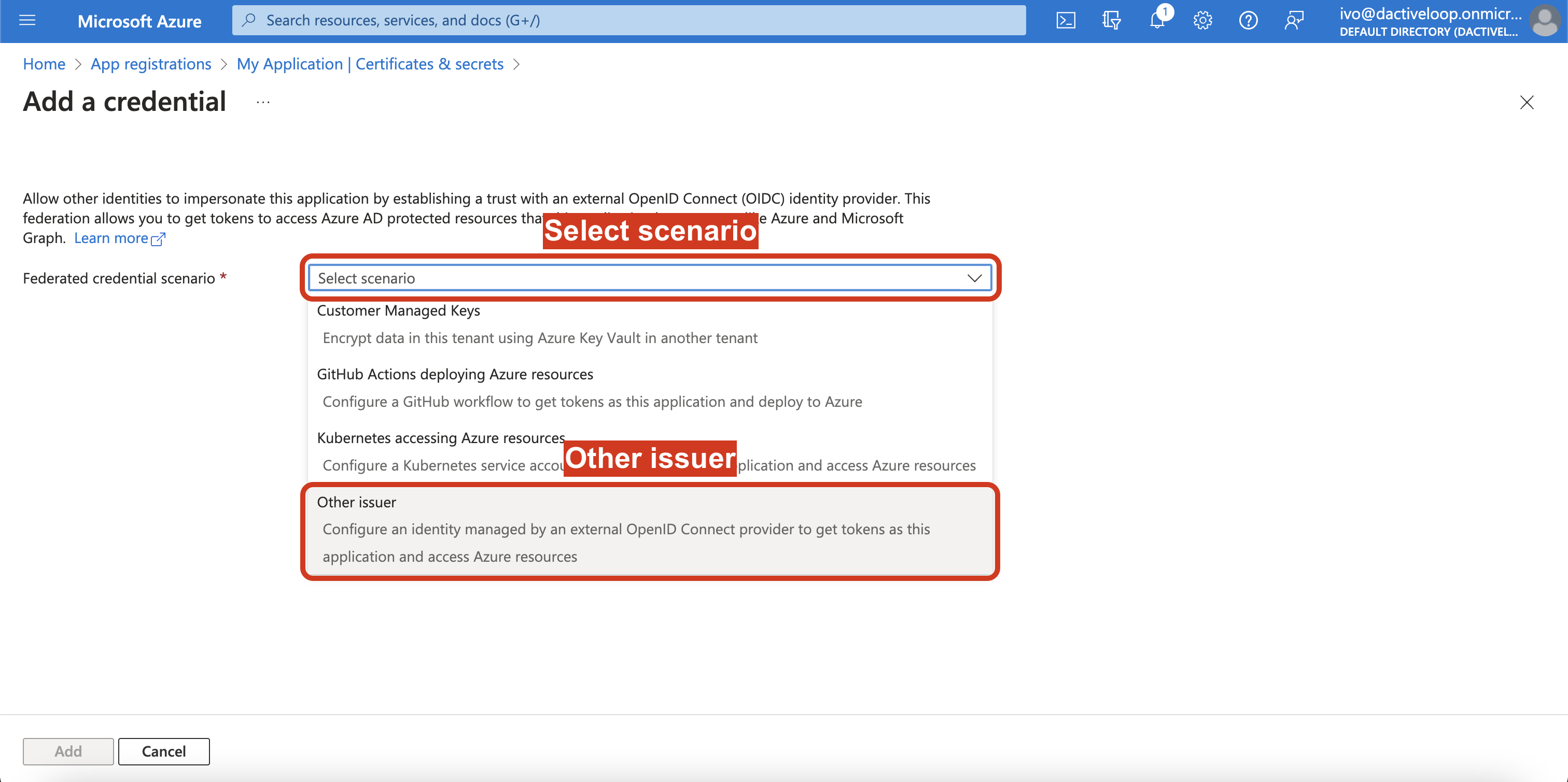6. Click on Federated credentials and Add credential.