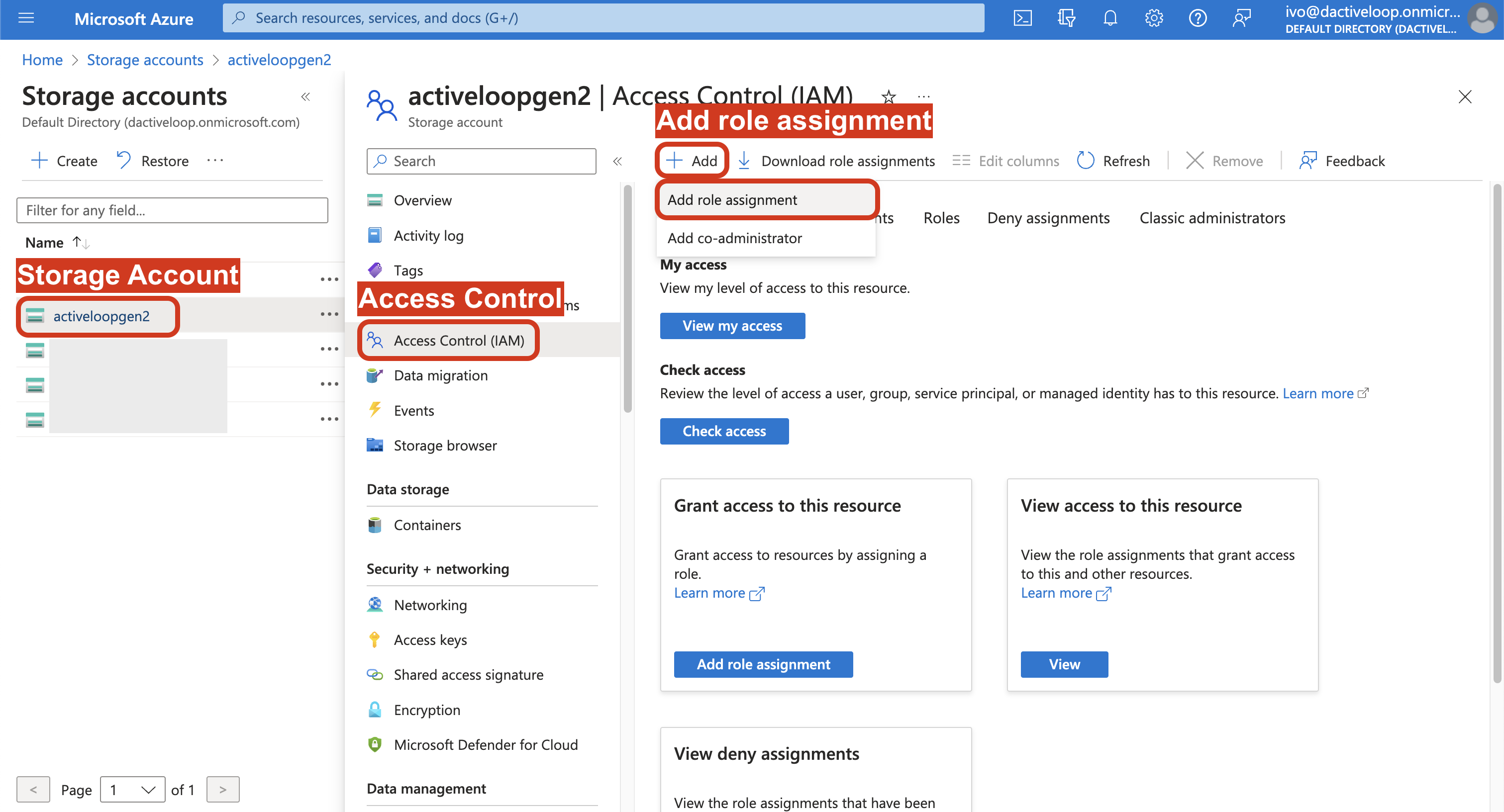 3. Select Access Control (IAM) and click Add, and select Add role assignment.
