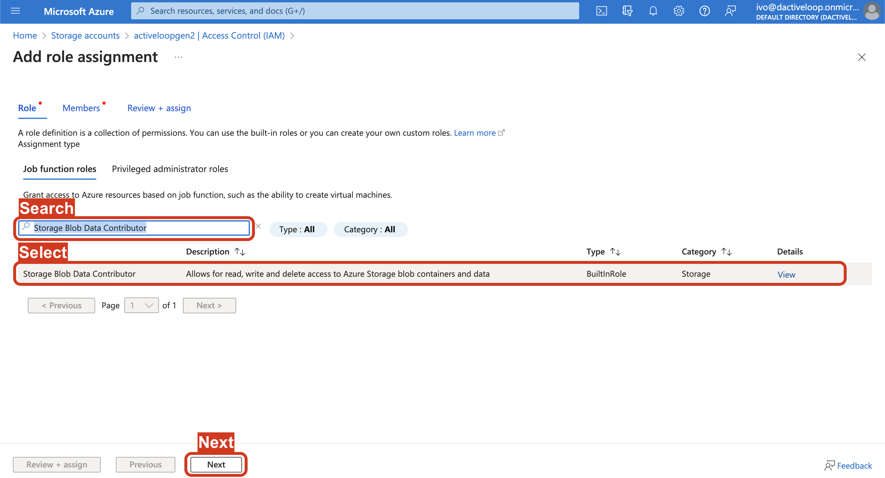 4. Search and select Storage Blob Data Contributor under the role names and click Next.