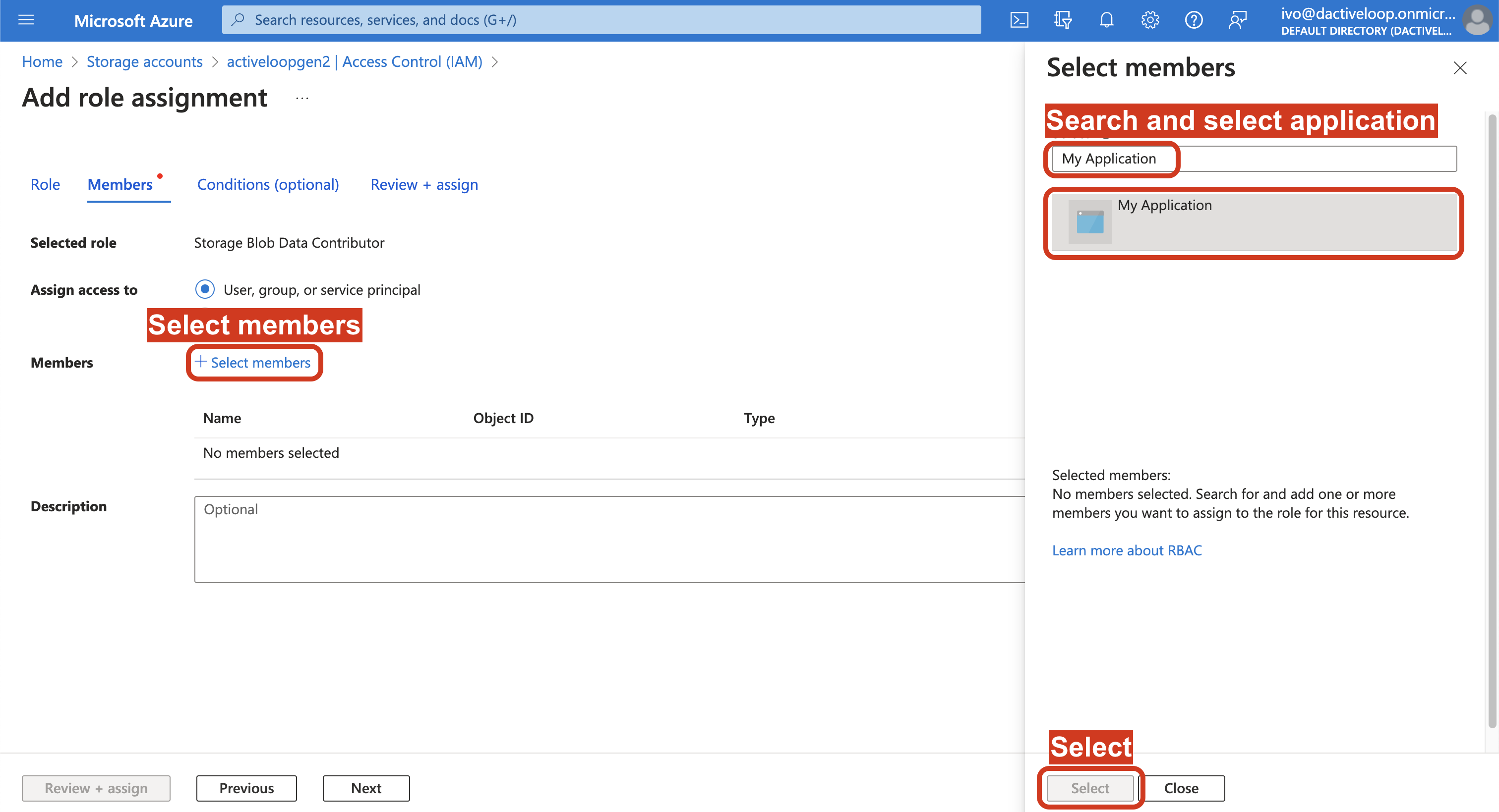 5. Click on the Select members link, and in the tab that opens up on the right, search by name and select the application you created in Step 1. Click Select at the bottom of the page.