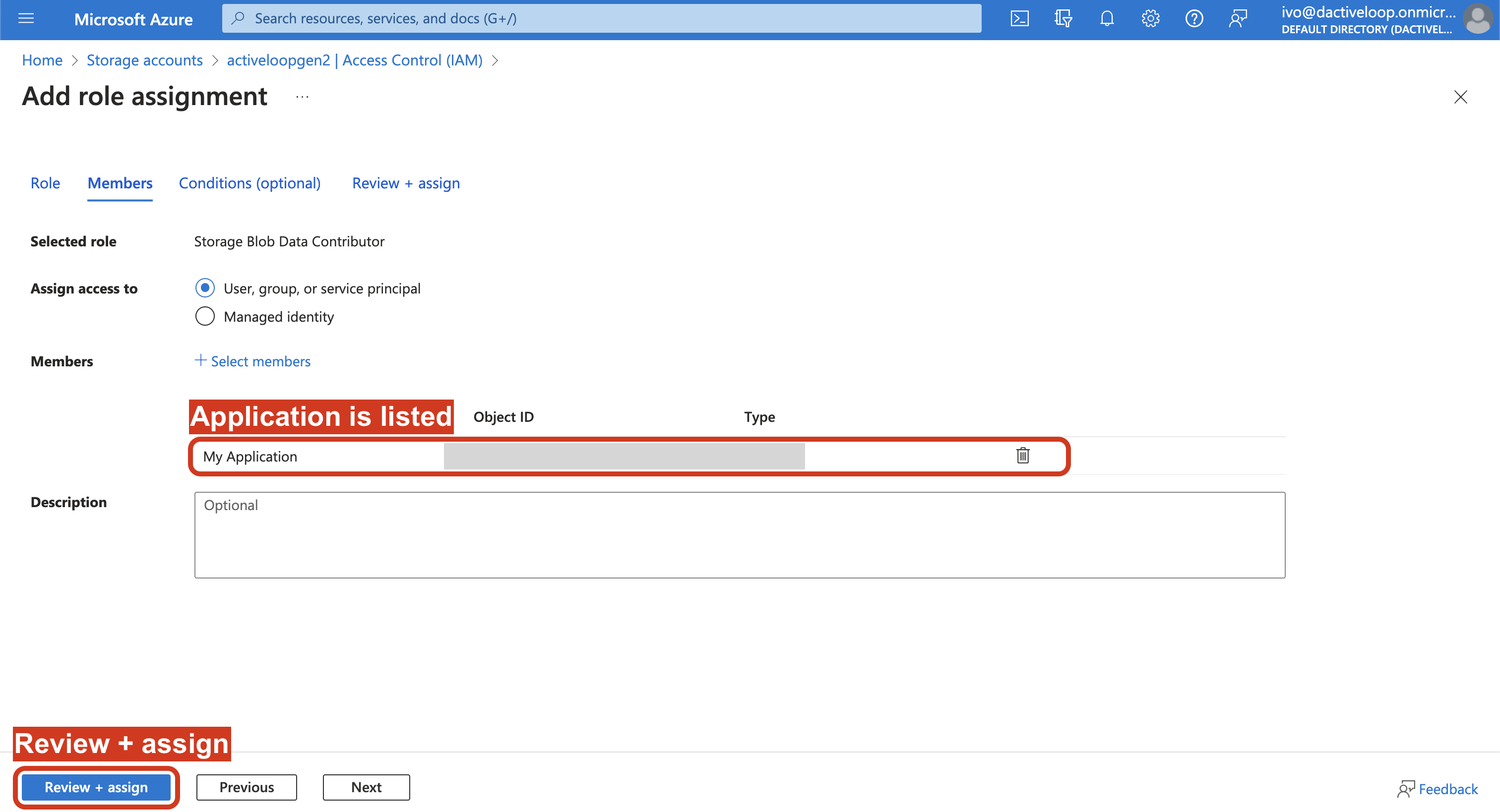 6. The application should appear in the list of Members, at which point you can click Review + assign.