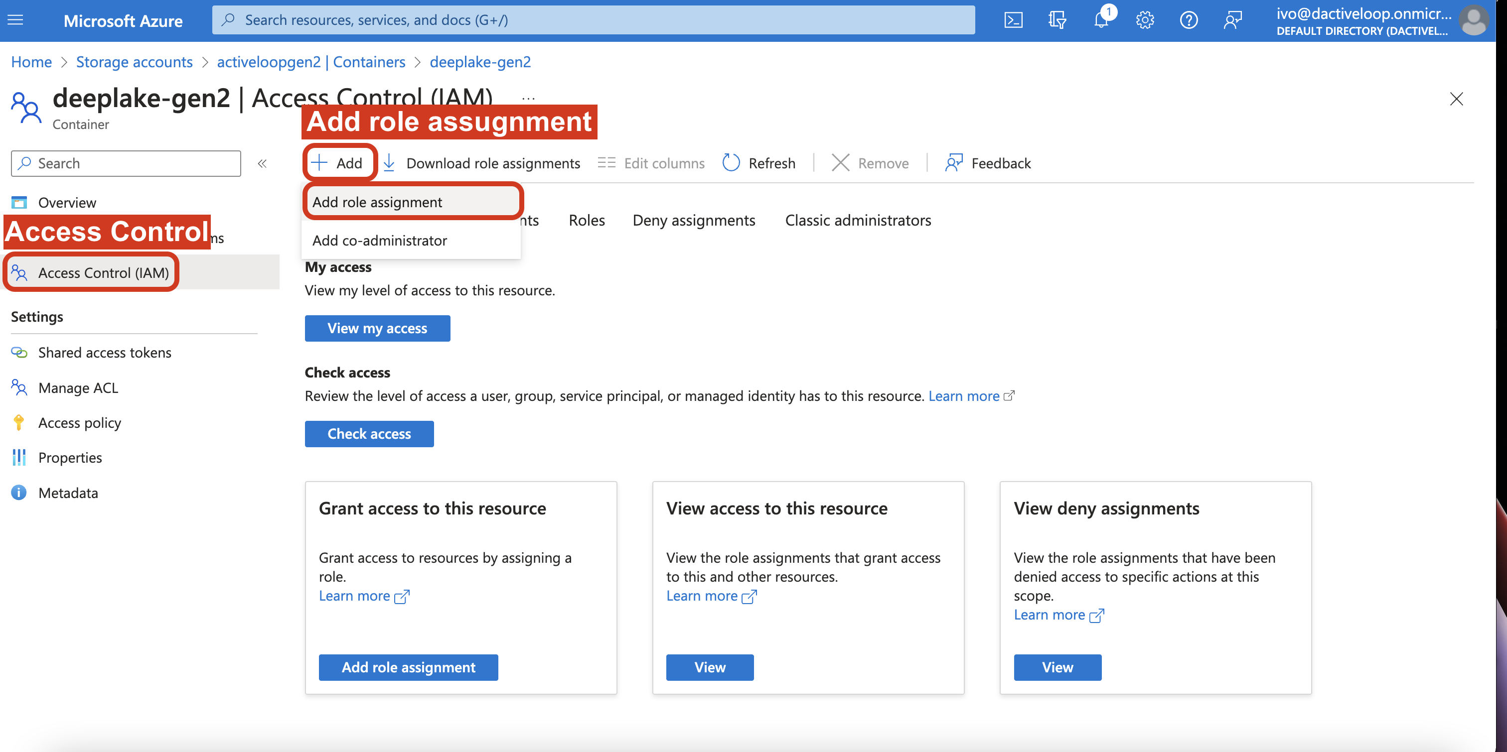 4. Select Access Control (IAM) and click Add, and select Add role assignment.