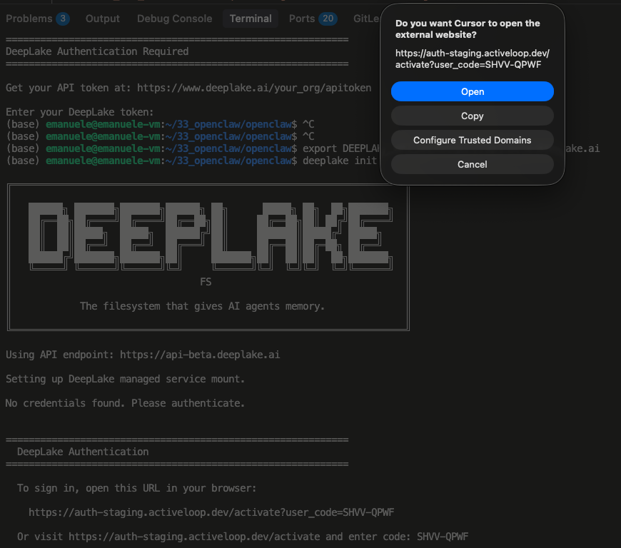 Install the Deeplake CLI, mount a persistent directory, and use it as shared memory for AI agents like Claude Code, Cursor, and OpenClaw.