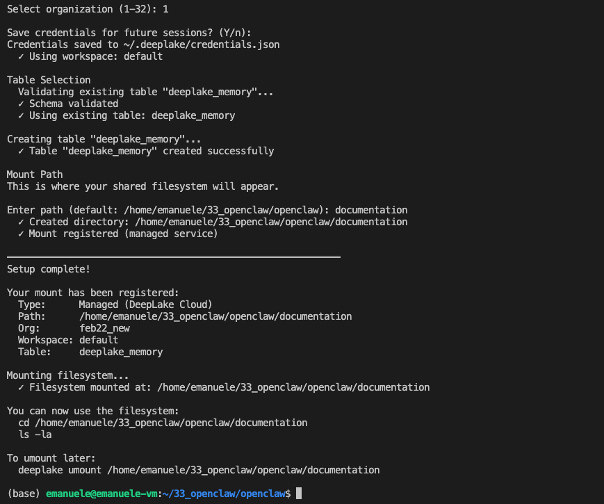 4. Choose mount path: you specify the local folder where the filesystem will be mounted (e.g. ~/agent-memory). The CLI connects it to your workspace and table, and the directory is live immediately.